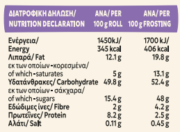 Ζύμη 67%: Αλεύρι ΣΙΤΟΥ, νερό, ζάχαρη 7.4%, μαργαρίνη: [φυτικά λίπη και έλαια (φοινικέλαιο, φοινικοστεαρίνη, σογιέλαιο), νερό, αλάτι, γαλακτωματοποιητές: (μονο- και διγλυκερίδια λιπαρών οξέων, πολυγλυκερίδια λιπαρών οξέων), ρυθμιστής οξύτητας: κιτρικό οξύ, χρωστική: β-καροτένιο, αρωματική ύλη], σκόνη ορού ΓΑΛΑΚΤΟΣ, μαγιά, μίγμα φυτικών ελαίων (ηλιέλαιο, βμβακέλαιο), παστεριωμένο ασπράδι ΑΥΓΟΥ σε σκόνη, βελτιωτικό ζύμης: (αλεύρι ΣΙΤΟΥ, γαλακτωματοποιητής (εστέρες του μονο- & δι-ακετυλο τρυγικού οξέος με μονο- & δι-γλυκερίδια λιπαρών οξέων, αντισυσσωματικό: ανθρακικό ασβέστιο, αντιοξειδωτικό: ασκορβικό οξύ, ένζυμα ΣΙΤΟΥ). Γέμιση 33%: Μαργαρίνη: [φυτικά λίπη και έλαια (φοινικέλαιο, φοινικοστεαρίνη, σογιέλαιο), νερό, αλάτι, γαλακτωματοποιητές: (μονο- και διγλυκερίδια λιπαρών οξέων, πολυγλυκερίδια λιπαρών οξέων), ρυθμιστής οξύτητας: κιτρικό οξύ, χρωστική: β-καροτένιο, αρωματική ύλη)], καστανή ζάχαρη 22,7%, λευκή ζάχαρη 17%, κανέλα 3.6%. Γλάσο: Ζάχαρη άχνη 49,2%, τυρί κρέμα [παστεριωμένο αγελαδινό ΓΑΛΑ, κρέμα ΓΑΛΑΚΤΟΣ, αλάτι, καλλιέργεια εκκίνησης, σταθεροποιητές: (κόμμι χαρουπιού, κόμμι γκουάρ)], αγελαδινό βούτυρο (περιέχει ΓΑΛΑ), νερό, αλάτι.ΟΔΗΓΙΕΣ ΨΗΣΙΜΑΤΟΣ