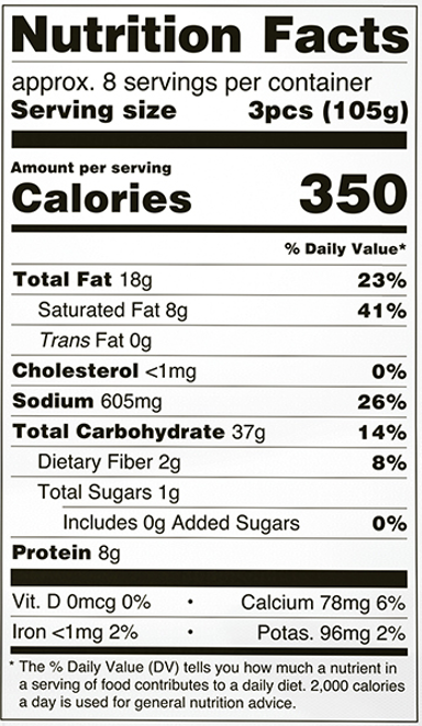 Ζύμη 66%: αλεύρι σίτου, μαργαρίνη [φοινικέλαιο, φοινικοστεαρίνη, σογιέλαιο, νερό, αλάτι, γαλακτοματοποιητές(μόνο- και δι- γλυεκρίδια λιπαρών οξέων, πολυγλυκερίδια λιπαρών οξέων), μέσο οξίνισης: κιτρικό οξύ, χρωστική: β-καροτένιο, άρωμα], νερό, γαλακτοματοποιητής: γλυκερίνη, αλάτι, ηλιέλαιο, φυτικές πρωτεϊνες, δεξτρόζη, μαλτοδεξτρίνη, άμυλο. Γέμιση 34%: νερό, τυρί κασέρι ΠΟΠ 8% (παστεριωμένο αιγοπρόβειο γάλα, αλάτι, πυτιά, οξυγαλακτική καλλιέργεια), τυρί κεφαλοτύρι (παστεριωμένο αιγοπρόβειο γάλα, αλάτι, πυτιά, οξυγαλακτική καλλιέργεια), ημισκληρο τυρί (παστεριωμένο αγελαδινό γάλα, αλάτι, πυτιά, οξυγαλακτική καλλιέργεια), σιμιγδάλι σίτου, άμυλο αραβοσίτου, ασπράδι αυγού σε σκόνη, τυρί γραβιέρα Νάξου ΠΟΠ 2%(παστεριωμένο αγελαδινό και αιγοπρόβειο γάλα, αλάτι, πυτιά, οξυγαλακτική καλλιέργεια), τυρί κεφαλογραβιερα ΠΟΠ 2%(παστεριωμένο αιγοπρόβειο γάλα, αλάτι, πυτιά, οξυγαλακτική καλλιέργεια), εκχύλισμα μαγιάς, αλάτι, αρωματική ύλη. Παράγεται σε εργοστάσιο που χρησιμοποιεί μουστάρδα, σουσάμι, ξηρούς καρπούς, προϊόντα σόγιας, σέλινο και αυγό.ΟΔΗΓΙΕΣ ΨΗΣΙΜΑΤΟΣ