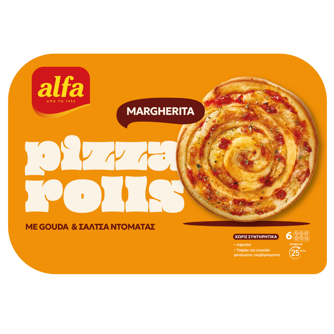 Τα νέα Pizza Rolls Margherita της alfa είναι ιδανικό snack για όλη την οικογένεια σε κάθε στιγμή της ημέρας! Με σάλτσα ντομάτας και τυρί gouda, η πιο επική απόλαυση που βγήκε ποτέ από το φούρνο σου!